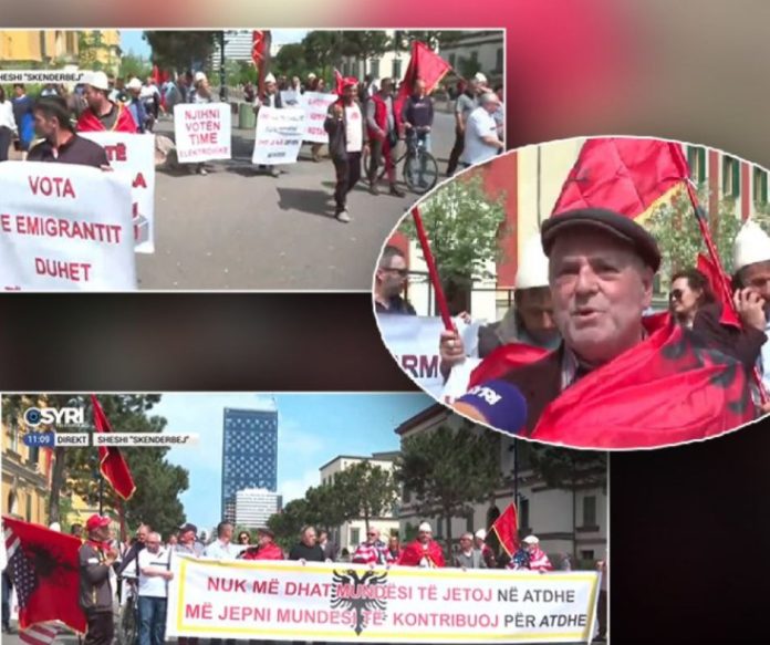 Një grup qytetarësh shqiptarë që kanë ardhur nga emigracioni, kanë dalë sot me flamuj dhe pankarta për të protestuar për të drejta me rastin e ditës së 1 Majit.