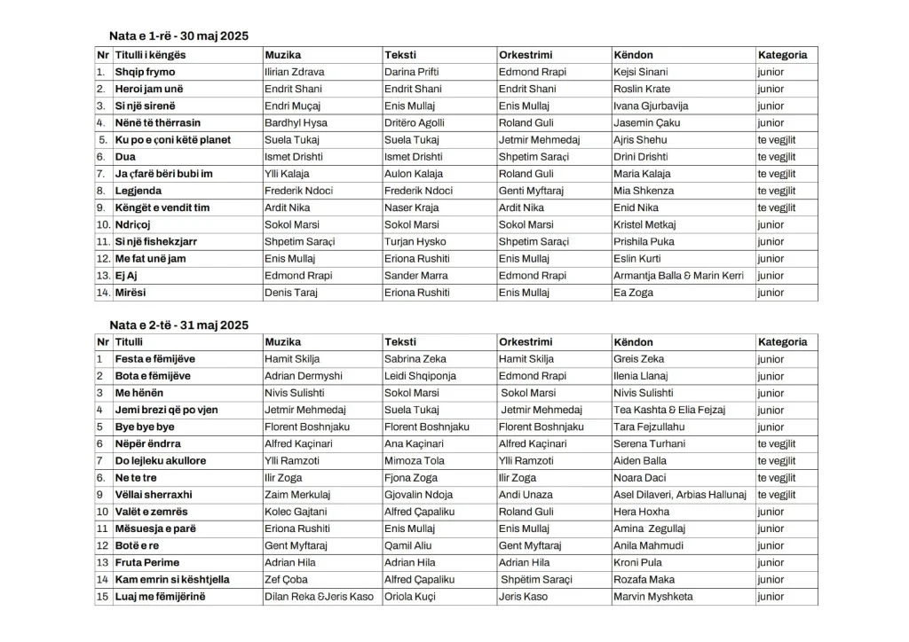 Përveç konkurrimit të këngëve, nuk do të mungojnë edhe emra të njohur si të ftuar: Nikol Çabeli, fituese e Junior vjet, Alis Kallaçi, Myfarete Laze, Robert Radoja, Inva Mula.