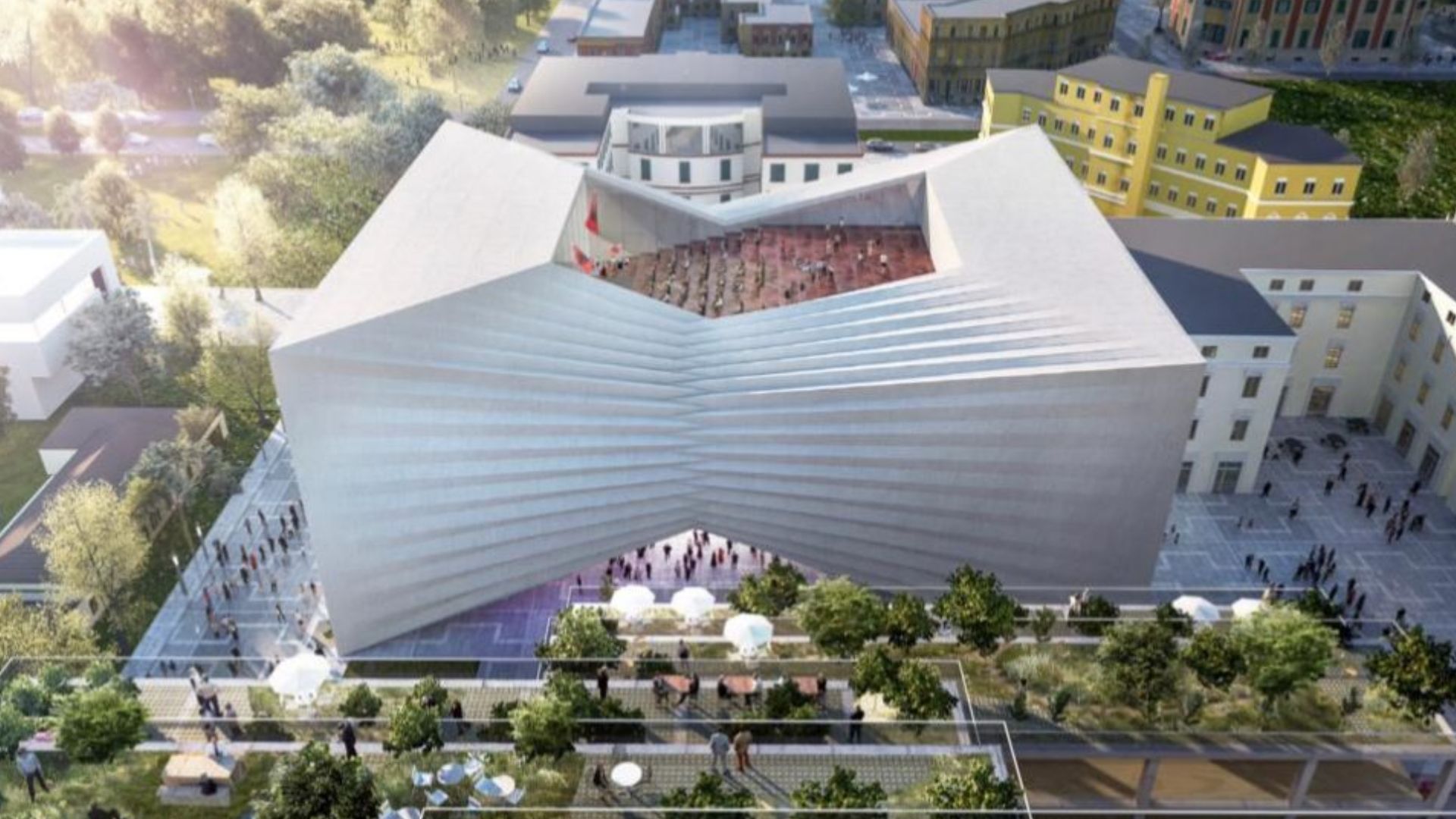 Pjerrësia e çatisë krijon një tjetër lloj hapësire së cilës i jepet një sfond dramatik nga vetë qyteti. Jo vetëm “zarfi” i ndërtesës është i përcaktuar për performanca, por edhe auditori dhe black box të cilat janë hapësira “tadicionale” kthehen në pjesëmarrëse aktive nëpërmjet marrëdhënies që kanë me fasadën dhe mënyrë sessi ndërveprojnë me kontekstin urban” thuhet në projektin arkitektonik të Teatrit të ri. /Monitor
