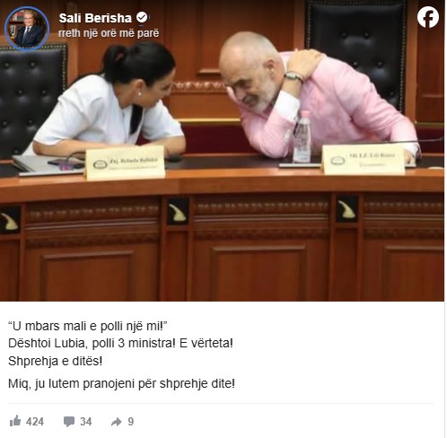 Kryedemokrati Sali Berisha ka komentuar në rrjete sociale ndryshimet në kabinetin qeveritar të kryeministrit Rama, mes të cilave ishte dhe shkarkimi i Belinda Ballukut.